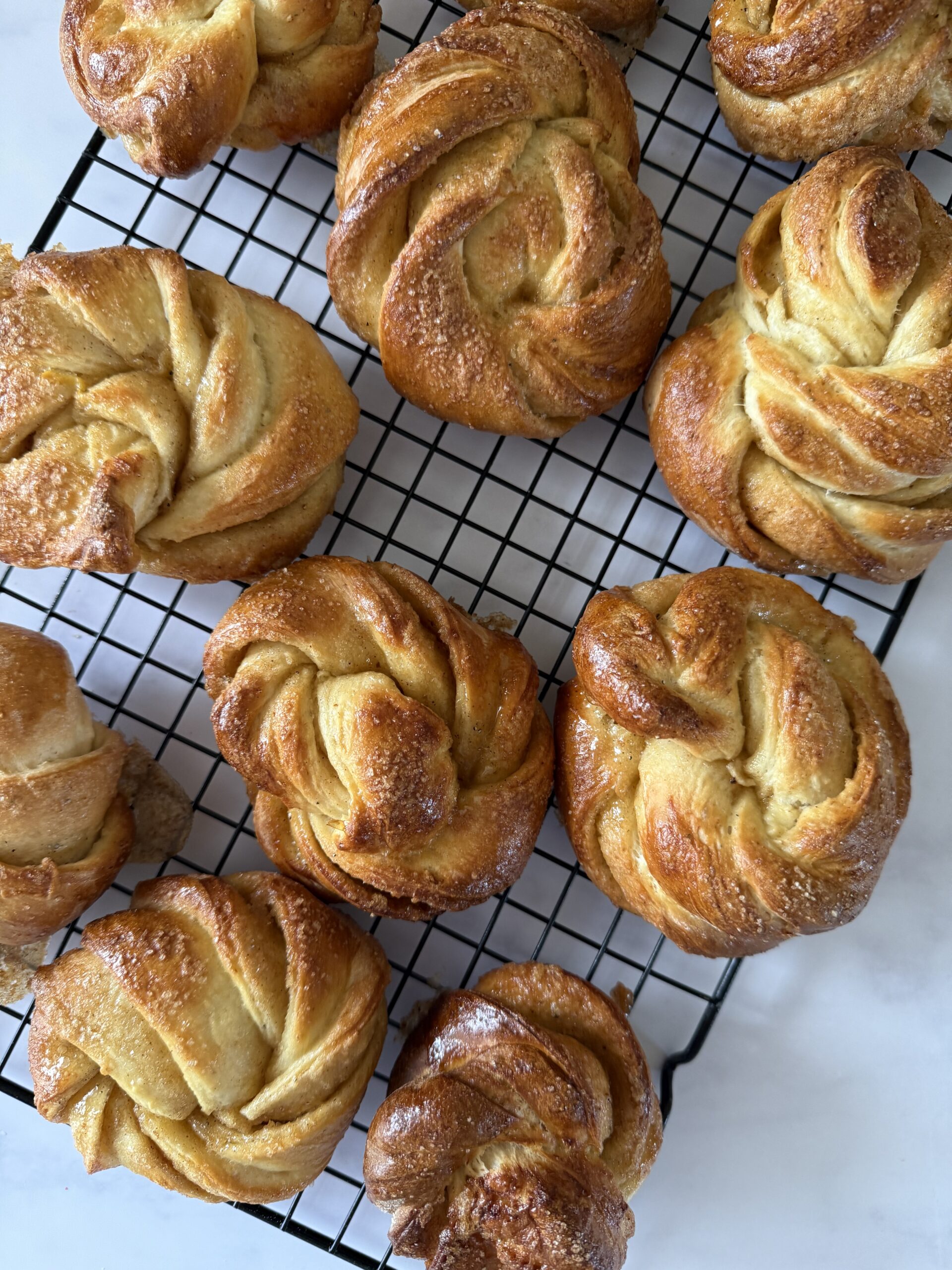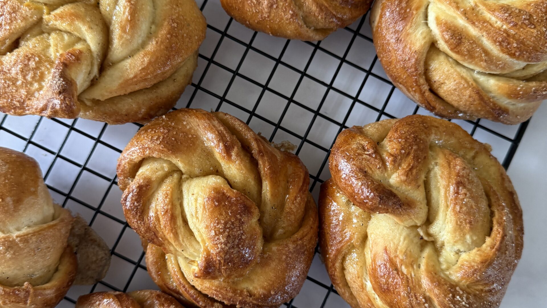 2. Add the flour, cardamom, sugar and yeast to a large bowl and mix to combine. Pour in the milk and butter and mix. Add in the egg and bring the dough together.